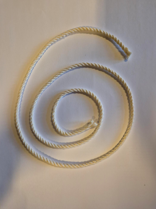 Start with a cotton braided rope of one metre length +- 3mm thick. The thickness of the rope has an effect on the handle lenghts at the end so make it a bit shorter if the rope is thin or a bit longer if the rope is thicker.